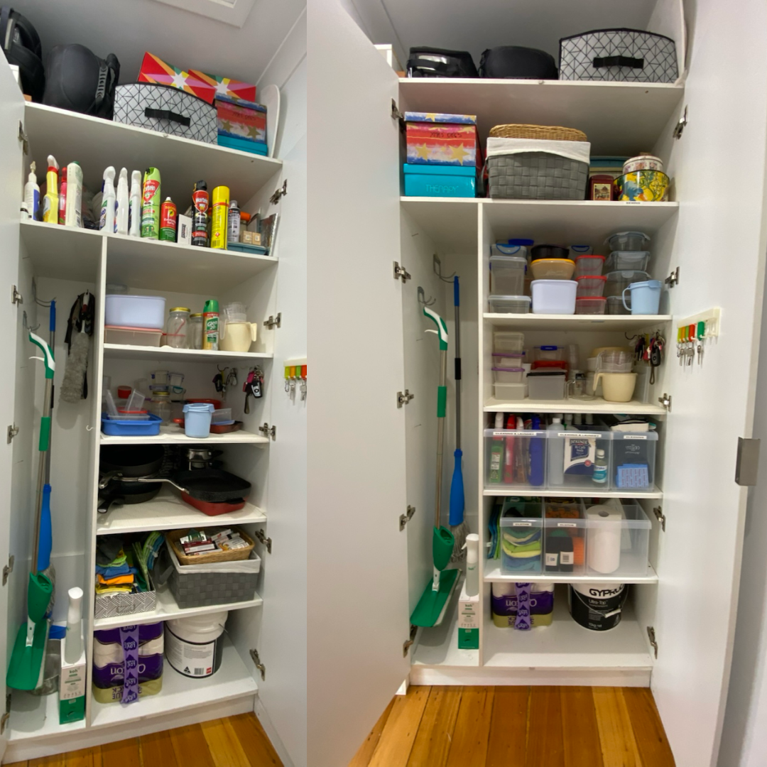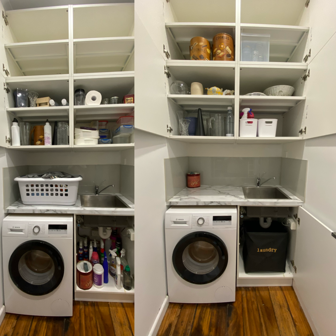By separating cleaning, kitchen and laundry items into clear categories, simple storage brought calm to organised chaos.